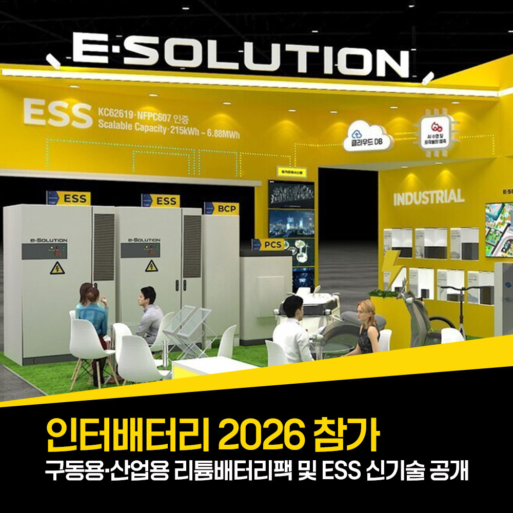 풍부한 기술력으로 ‘고안전 리튬배터리’ 개발에 앞장서 온 e – Solution은 국내 중소형 리튬배터리 업계 최초로 ICT원격모니터링 시스템과 AI분석을 통한 사전불량예측 시스템을 도입하였습니다.